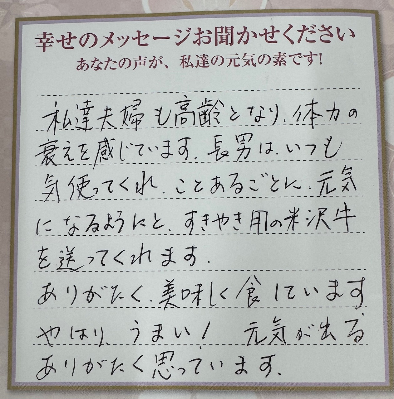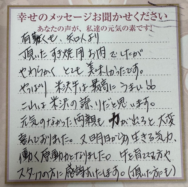 米沢牛のすき焼きで元気を感じていただけたとのこと、私たちも本当に嬉しいです。