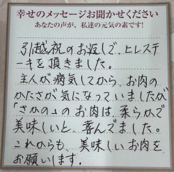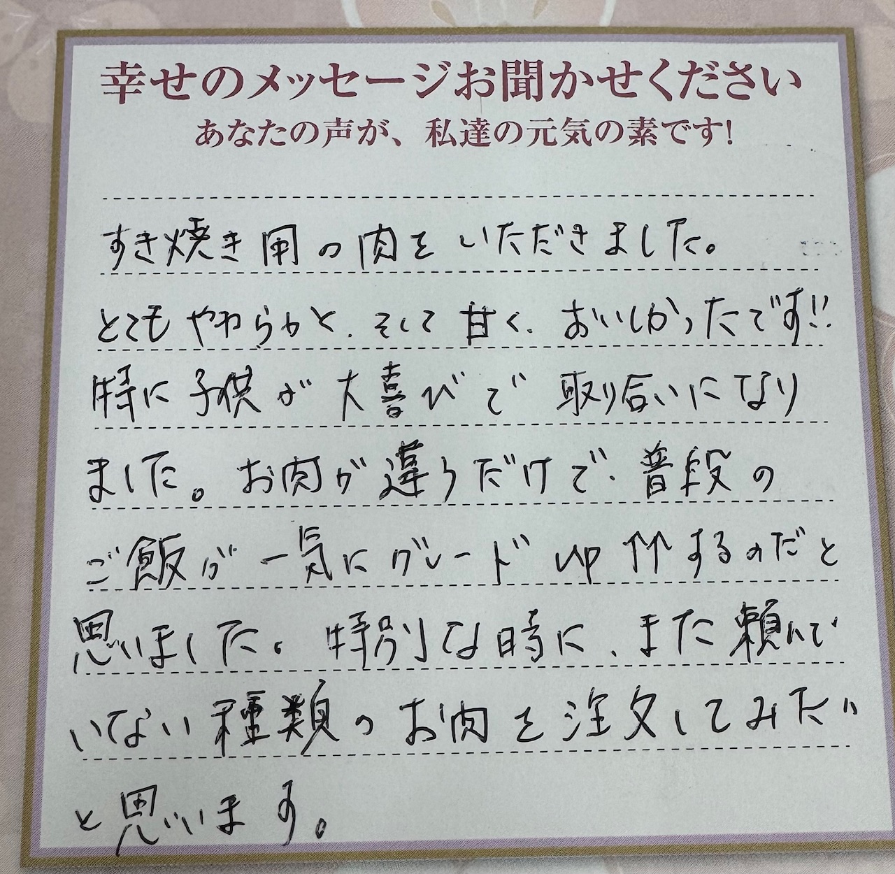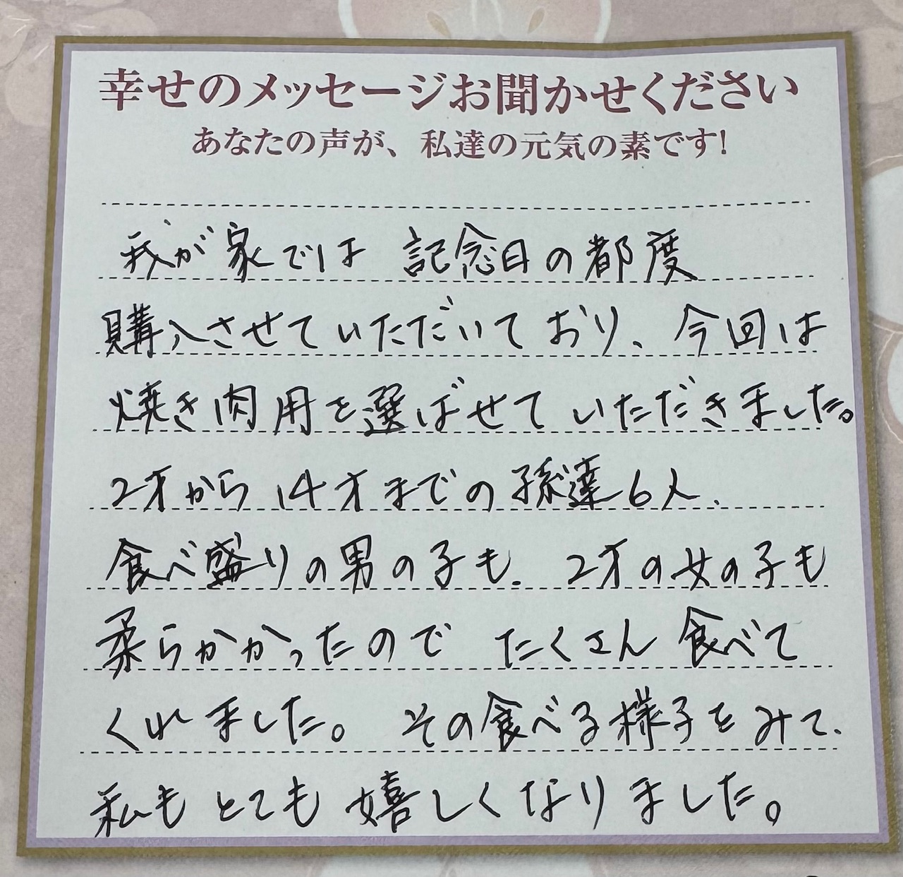 小さなお孫さんから食べ盛りのお孫さんまで、みんなでお肉を楽しんでいただけたとのこと、