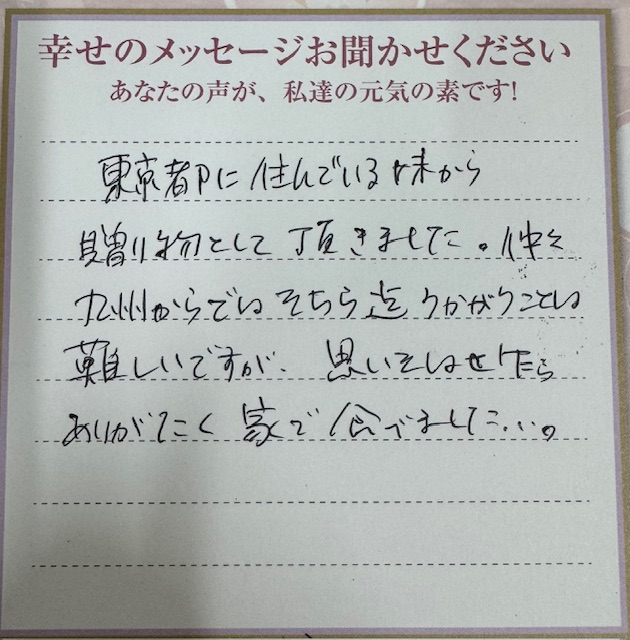遠く離れた妹さんからの贈り物、嬉しいですね。