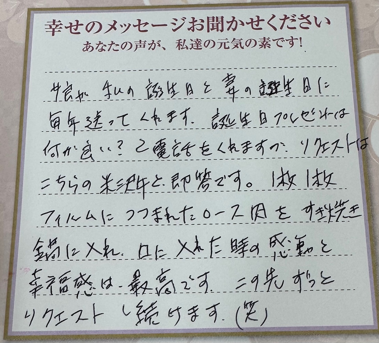 ご家族の誕生日に毎年米沢牛をお楽しみいただいているとのこと、とても心が温まるお話でした。