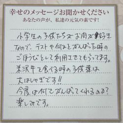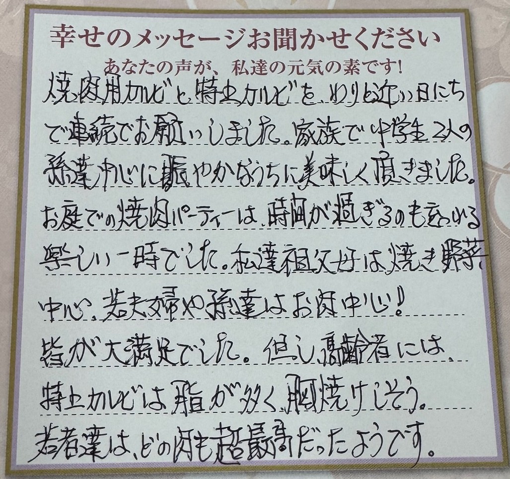 大変おいしくて、肉の質も良く油もあまくて、家族皆が喜んで食べてくれました。