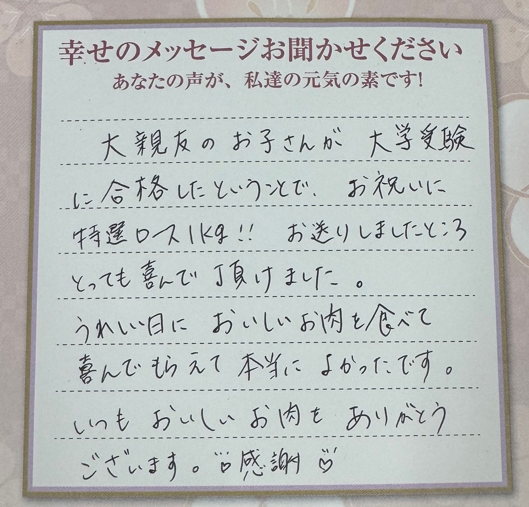 祝いに特選ロース1kg!! お送りしましたところとっても喜んで頂けました。