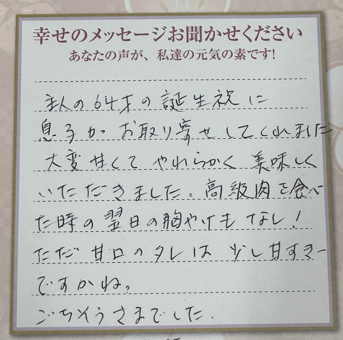ご主人様のお誕生日という大切な日に、すき焼きでお召し上がりいただけたとのこと、とても嬉しいです!