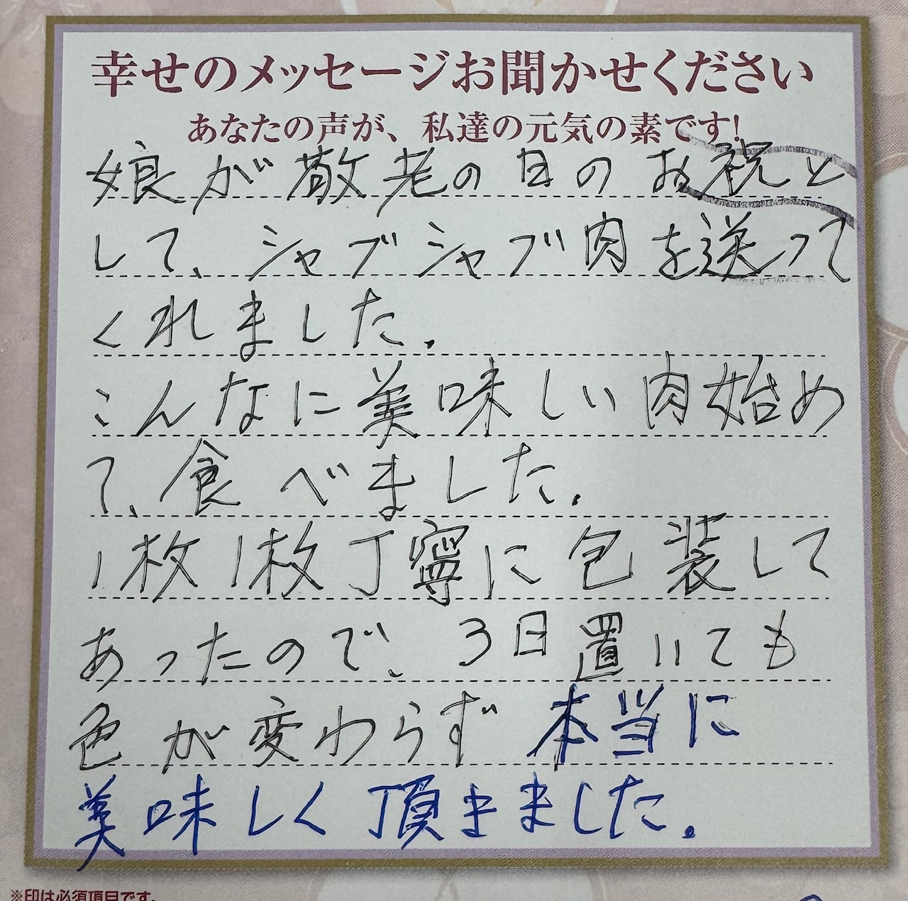 敬老の日に娘さんからシャブシャブ肉の贈りもの、とても心温まりますね。