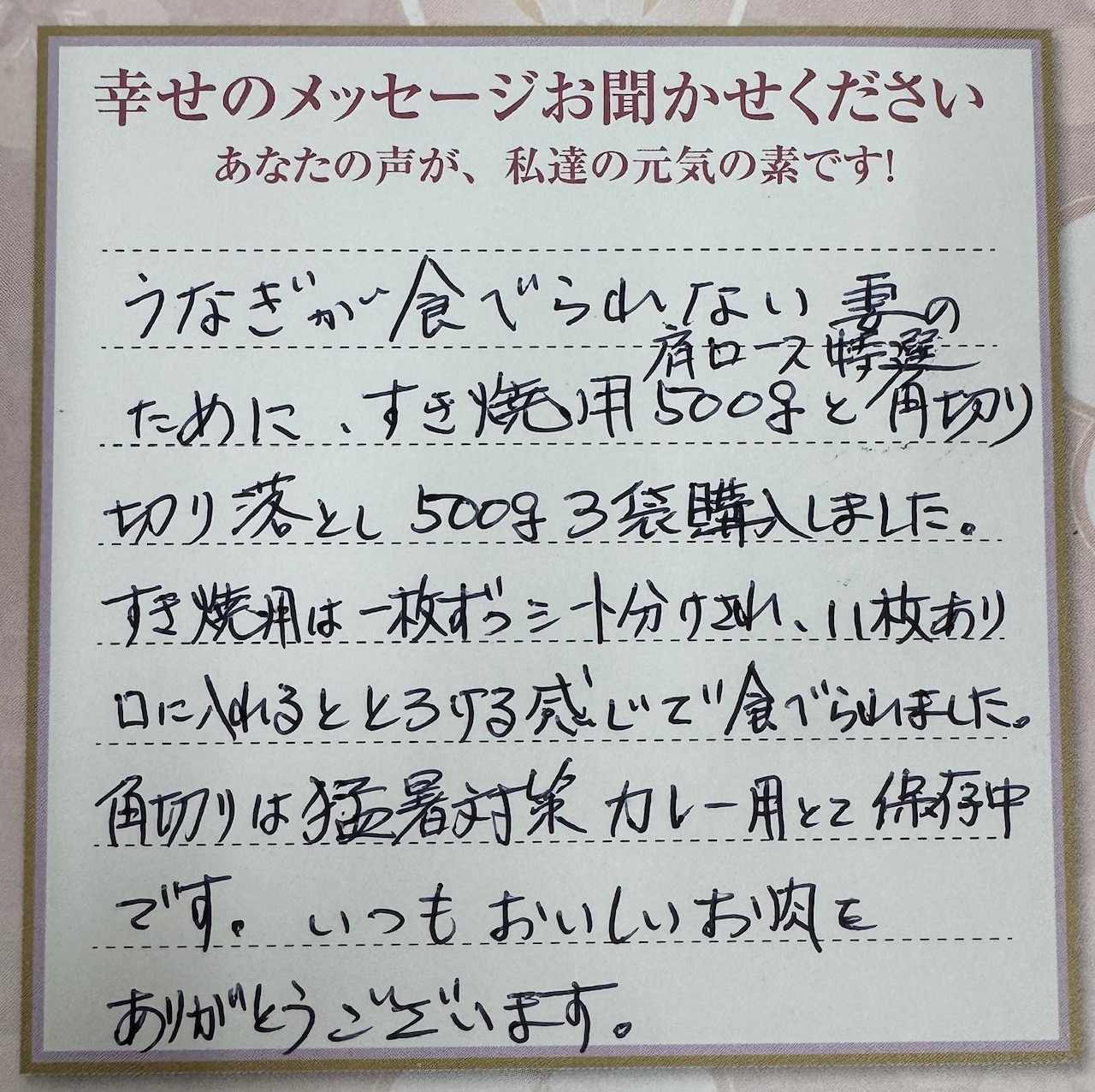 すき焼用500gと角切り切り落とし500gを3袋購入しました。