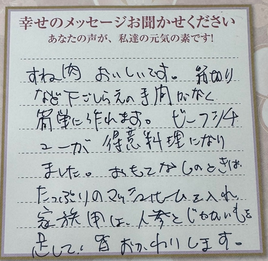 これからも、ほっとできる時間のお供になれるお肉をお届けしていきますね。