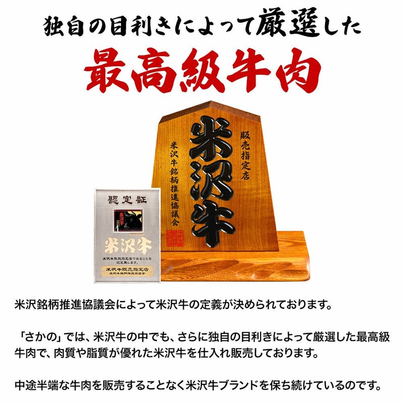 米沢銘柄推進協議会によって米沢牛の定義が決められております。「さかの」では、米沢牛の中でも、さらに独自の目利きによって厳選した最高級牛肉で、肉質や脂質が優れた米沢牛を仕入れ販売しております。